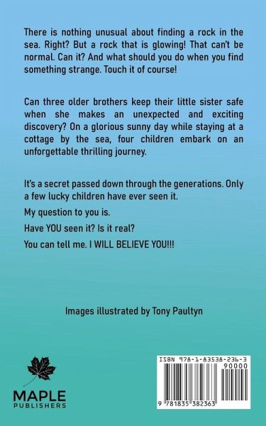 Is it real? Are you one of the lucky children that have seen it? Did you touch it? Shh! It's a secret! A glorious sunny day at the start of the summer holidays and a whole week in a cottage by the sea. What could be better? Aaliyah, Liam, Matthew and Hudson are four children, enjoying a day at the seaside completely unaware that they are about to stumble across something that will make their holiday more exciting than they could ever have imagined. Because... There is something in the water - it's a rock! Oh, but this is not just any rock, it's strange - it's glowing and shimmering, sending colourful rays of light through the water. It's fascinating, so fascinating that the children find it hard to look away and the urge to touch it is just too strong! And so the adventure begins. 'It is beautiful.. but I don't understand why you are so excited, it is just a rock, it's a stunning rock, but still just a rock!' 'Touch it..... Go on touch it!' 'Just trust me, don't panic - and breathe!'