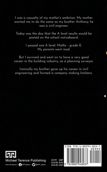 I was a casualty of my mother's ambition. My mother wanted me to do the same as my brother Anthony; he was a civil engineer. Today was the day that the A level results would be posted on the school noticeboard. I passed one A level: Maths - grade E. My parents went mad. But I survived and went on to have a very good career in the building industry, as a planning surveyor. Ironically my brother gave up his career in civil engineering and formed a company making kitchens.