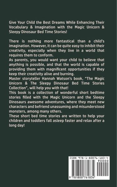 Give Your Child the Best Dreams While Enhancing Their Vocabulary & Imagination with the Magic Unicorn & Sleepy Dinosaur Bed Time Stories! There is nothing more fantastical than a child's imagination. However, it can be quite easy to inhibit their creativity, especially when they live in a world that requires them to conform. As parents, you would want your child to believe that anything is possible, and that the world is capable of providing them with magnificent opportunities if they keep their creativity alive and burning. Master storyteller Hannah Watson's book, "The Magic Unicorn & The Sleepy Dinosaur Bed Time Stories Collection", will help you with that! This book is a collection of wonderful short bedtime stories filled with the Magic Unicorn and the Sleepy Dinosaurs awesome adventures, where they meet new characters and befriend unassuming and misunderstood monsters, among many others. These short bed time stories are written to help your children and toddlers fall asleep faster and relax after a long day! In this magical book, your child will:Relax their worries away in a comforting space, where you get to snuggle and read bed time stories together Enhance their empathy, vocabulary, and imagination as they explore the wonderful world of majestic, adventurous unicorns Engage in conversation and exploration as you read about every character and their equally amazing friends Have a peaceful, deep sleep, safe with the knowledge that the world isn't too bad after all, especially when mom and dad are here And so much more! Let your child's imagination run wild, as they embark on a journey towards dreamland with you by their side. In this book, your child will have wonderful dreams filled with great dinosaurs and magical unicorns all throughout the night!