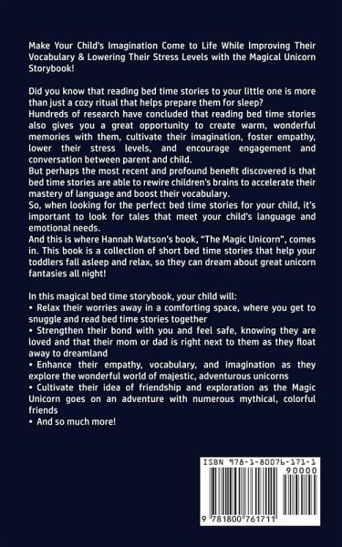 Make Your Child's Imagination Come to Life While Improving Their Vocabulary & Lowering Their Stress Levels with the Magical Unicorn Storybook! Did you know that reading bed time stories to your little one is more than just a cozy ritual that helps prepare them for sleep? Hundreds of research have concluded that reading bed time stories also gives you a great opportunity to create warm, wonderful memories with them, cultivate their imagination, foster empathy, lower their stress levels, and encourage engagement and conversation between parent and child. But perhaps the most recent and profound benefit discovered is that bed time stories are able to rewire children's brains to accelerate their mastery of language and boost their vocabulary. So, when looking for the perfect bed time stories for your child, it's important to look for tales that meet your child's language and emotional needs. And this is where Hannah Watson's book, "The Magic Unicorn", comes in. This book is a collection of short bed time stories that help your toddlers fall asleep and relax, so they can dream about great unicorn fantasies all night! In this magical bed time storybook, your child will:Relax their worries away in a comforting space, where you get to snuggle and read bed time stories together Strengthen their bond with you and feel safe, knowing they are loved and that their mom or dad is right next to them as they float away to dreamland Enhance their empathy, vocabulary, and imagination as they explore the wonderful world of majestic, adventurous unicorns Cultivate their idea of friendship and exploration as the Magic Unicorn goes on an adventure with numerous mythical, colorful friends And so much more! Children are like porous sponges that absorb every bit of information from the environment around them. When you read The Magic Unicorn to them every night, they will be able to simmer in the positivity as well as the educational bits that every chapter has to offer!