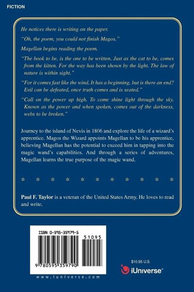 He notices there is writing on the paper. 'Oh, the poem, you could not finish Magos." Magellan begins reading the poem. 'The book to be, is the one to be written. Just as the cat to be, comes from the kitten. For the way has been shown by the light. The law of nature is within sight." 'For it comes fast like the wind. It has a beginning, but is there an end? Evil can be defeated, once truth comes and is seated." 'Call on the power up high. To come shine light through the sky. Known as the power and when spoken, comes out of the darkness, webs to be broken." Journey to the island of Nevis in 1806 and explore the life of a wizard's apprentice. Magos the Wizard appoints Magellan to be his apprentice, believing Magellan has the potential to exceed him in tapping into the magic wand's capabilities. And through a series of adventures, Magellan learns the true purpose of the magic wand.