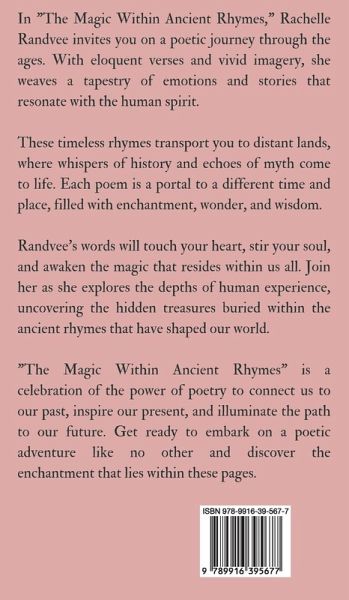 In "The Magic Within Ancient Rhymes," Rachelle Randvee invites you on a poetic journey through the ages. With eloquent verses and vivid imagery, she weaves a tapestry of emotions and stories that resonate with the human spirit. These timeless rhymes transport you to distant lands, where whispers of history and echoes of myth come to life. Each poem is a portal to a different time and place, filled with enchantment, wonder, and wisdom. Randvee's words will touch your heart, stir your soul, and awaken the magic that resides within us all. Join her as she explores the depths of human experience, uncovering the hidden treasures buried within the ancient rhymes that have shaped our world. "The Magic Within Ancient Rhymes" is a celebration of the power of poetry to connect us to our past, inspire our present, and illuminate the path to our future. Get ready to embark on a poetic adventure like no other and discover the enchantment that lies within these pages. Copyright © 2024 Book Fairy Publishing
