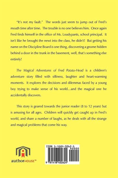 "It's not my fault." The words just seem to jump out of Fred's mouth time after time. The trouble is no one believes him. Once again Fred finds himself in the office of Ms. Loudypants, school principal. It isn't like he brought the newt into the class, he didn't! But getting his name on the Discipline Board is one thing, discovering a gnome hidden behind a door in the trunk in the basement, well, that's something else entirely! The Magical Adventures of Fred Potato-Head is a children's adventure story filled with silliness, laughter and heart-warming moments. It explores the decisions and dilemmas faced by a young boy trying to make sense of his world.and the magical one he accidentally discovers. This story is geared towards the junior reader (8 to 12 years) but is amusing for all ages. Children will quickly get caught up in Fred's world, and share a number of laughs, as he deals with all the strange and magical problems that come his way.