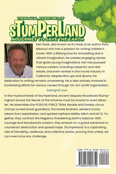 Ken Hauk, also known as KJ Hauk, is an author from Missouri who has a passion for writing children's books. With a lifelong love for storytelling and a vibrant imagination, he creates engaging stories that ignite young imaginations. Ken has pursued various careers, including carpentry and real estate, and even worked in the movie industry in California. Despite life's ups and downs, his dedication to writing remains unwavering. He is also actively involved in fundraising efforts for various causes through his non-profit organization, Doitright3.com In the mystical forest of The Magical Adventures of Stumperland ancient Sequoia Woodward Stumpingham knows the Secret of the Universe must be shared to avert disaster. He assembles the POSITIVE FORCE TEAM: Mookie and Dookie, circus chimps turned forest guardians; the Doolie Brothers, sentient trucks reborn from exploitation; and spirited orphans Malibu Mitch and M.T.II. Together, they confront the Negators threatening Earth's balance. With courage and Woodward's wisdom, they embark on a grand adventure to counteract destruction and spread hope. 'The Magical Adventures of Stumperland' is a captivating tale of friendship, resilience, and collective action, proving that united, we can overcome any challenge.