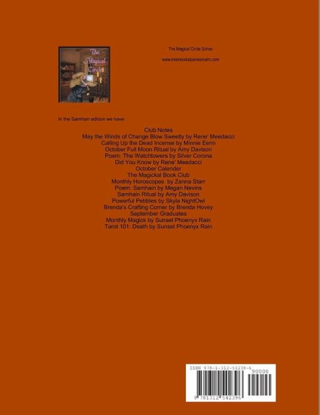 In the Samhain edition we have: Club Notes May the Winds of Change Blow Sweetly by Rene' Meedacci Calling Up the Dead Incense by Minnie Eerin October Full Moon Ritual by Amy Davison Poem: The Watchtowers by Silver Corona Did You Know by Rene' Meedacci October Calender The Magickal Book Club Monthly Horoscopes by Zanna Starr Poem: Samhain by Megan Nevins Samhain Ritual by Amy Davison Powerful Pebbles by Skyla NightOwl Brenda's Crafting Corner by Brenda Hovey September Graduates Monthly Magick by Sunset Phoenyx Rain Tarot 101: Death by Sunset Phoenyx Rain