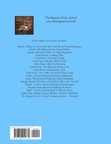 In the March 2016 issue, we have: Article: 5 Ways to Clean Out the Cobwebs by Freyja Mahogany Article: My Motivation by DannielleRae Article: Powerful Pebbles by Skyla Nightowl Club Notes: Crafting Club Club Notes: Divination Club Club Notes: Kitchen Witch Club Club Notes: LBGTQ Network Club Notes: The Magickal Book Club Club Notes: Photography Club Club Notes: The TMC Facebook Chat Group Game: Crossword Puzzle by Freyja Mahogany Game: Word Search Puzzle by Freyja Mahogany Ritual: March Full Moon Ritual by Colleen M. Criswell Ritual - A New You by Obsidian MoonDragon Ritual: Ostara Ritual by Kalloype Rothnas Spell - Up the Anchor Bath by Minnie Eerin Spell of the Month Contest Winner: Theme: Third Eye The Magical Circle School Graduates January - February