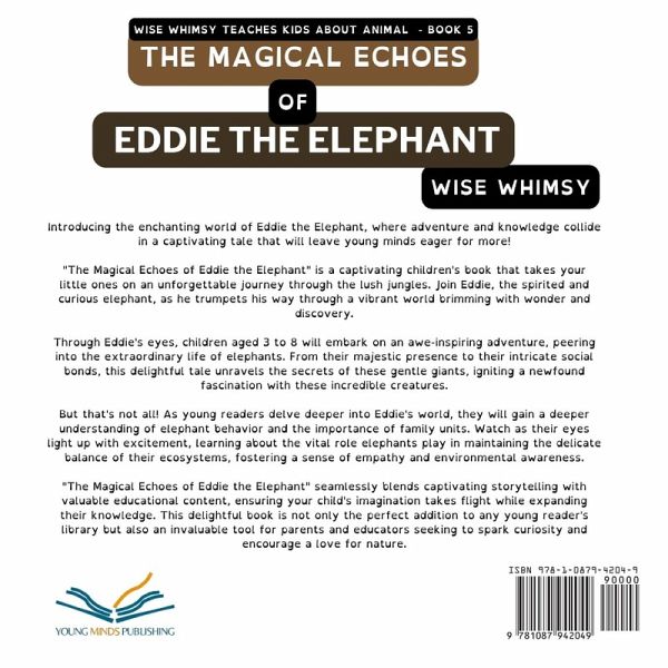 Introducing the enchanting world of Eddie the Elephant, where adventure and knowledge collide in a captivating tale that will leave young minds eager for more! "The Magical Echoes of Eddie the Elephant" is a captivating children's book that takes your little ones on an unforgettable journey through the lush jungles. Join Eddie, the spirited and curious elephant, as he trumpets his way through a vibrant world brimming with wonder and discovery. Through Eddie's eyes, children aged 3 to 8 will embark on an awe-inspiring adventure, peering into the extraordinary life of elephants. From their majestic presence to their intricate social bonds, this delightful tale unravels the secrets of these gentle giants, igniting a newfound fascination with these incredible creatures. But that's not all! As young readers delve deeper into Eddie's world, they will gain a deeper understanding of elephant behavior and the importance of family units. Watch as their eyes light up with excitement, learning about the vital role elephants play in maintaining the delicate balance of their ecosystems, fostering a sense of empathy and environmental awareness. "The Magical Echoes of Eddie the Elephant" seamlessly blends captivating storytelling with valuable educational content, ensuring your child's imagination takes flight while expanding their knowledge. This delightful book is not only the perfect addition to any young reader's library but also an invaluable tool for parents and educators seeking to spark curiosity and encourage a love for nature. Prepare to be enchanted by the stunning illustrations that bring Eddie's world to life, capturing the sheer beauty and majesty of elephants in all their glory. Each page turn will transport your child to a vibrant landscape teeming with colors, inviting them to join Eddie on his magical journey. So, why wait? Dive into the unforgettable world of Eddie the Elephant today and watch as your child's imagination roars to life. Let them discover the magic that lies within the hearts of these incredible creatures and become inspired to protect our precious planet. "The Magical Echoes of Eddie the Elephant" is an adventure like no other, combining entertainment and education into a must-have addition for every young explorer's bookshelf. Grab your copy now and embark on an unforgettable journey today!