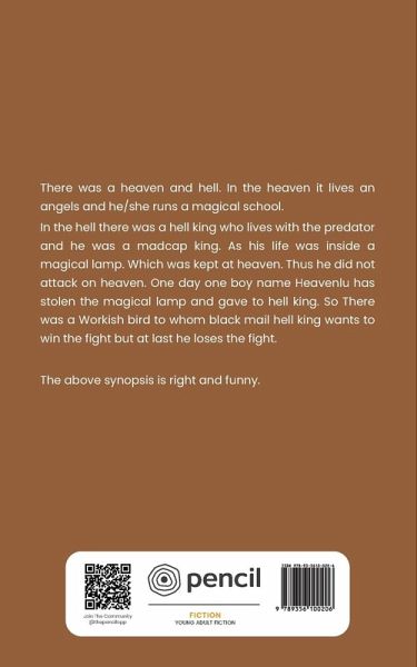 There was a heaven and hell. In the heaven it lives an angels and he/she runs a magical school. In the hell there was a hell king who lives with the predator and he was a madcap king. As his life was inside a magical lamp. Which was kept at heaven. Thus he did not attack on heaven. One day one boy name Heavenlu has stolen the magical lamp and gave to hell king. So There was a Workish bird to whom black mail hell king wants to win the fight but at last he loses the fight. The above synopsis is right and funny.
