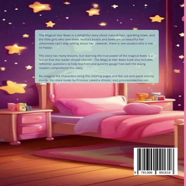 The Magical Hair Bows is a delightful story about natural hair, sparkling bows, and the little girls who love them. Kesha's braids and bows are so beautiful her classmates can't stop talking about her. However, there is one student who is not so happy. The story encourages kindness and forgiveness. It also helps young readers identity feelings of jealousy. Learning the true power of the magical bows is the greatest lesson of them all. Reflection questions are included to help parents and teachers gauge how well the young readers comprehend this story. Re-imagine the characters using the coloring pages and the cut-and-paste activity inside. The paperback edition comes with (6) extra coloring pages and more bows to use for the cut and paste activity. This interactive storybook makes a wonderful read at bedtime or reading time in class.