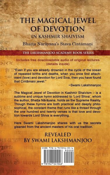 "Even if you are already drowned in the cycle of the ocean of repeated births and deaths, when you once find attachment (love) and devotion for Lord Shiva, then you have found that Cintamani jewel." ~Swami Lakshmanjoo "The Magical Jewel of Devotion in Kashmir Shaivism - Stava Cintamani" as revealed by Swami Lakshmanjoo, is a sublime and unique hymn addressed to 'Lord Shiva', whom the author, Bhatta Narayana, clearly holds as the Supreme Reality. Though these hymns are both practical and deeply philosophical, the constant theme that runs like a thread through the one hundred and twenty verses is that love and devotion towards Lord Shiva is everything. That Bhatta Narayana composed his hymn with the intention of introducing his audience to the richness of the path of non-dual Kashmir Shaivism is clearly visible in his unique interpretation of the ancient and highly revered Gayatri mantra: "I don't care to possess that effulgent light (tat savitur varenyam) of the three worlds (bhuh, bhuvah and svah), and I don't need my intellect elevated to the state of universal understanding (dhiyo yo nah pracodayat); I want only for that effulgent light to direct me on the path of Shaivism - that is all I long for - and that is the only favor I ask of Gayatri." In this book Swami Lakshmanjoo shares with us the secrets gleaned from the ancient masters of the oral tradition of Kashmir Shaivism.