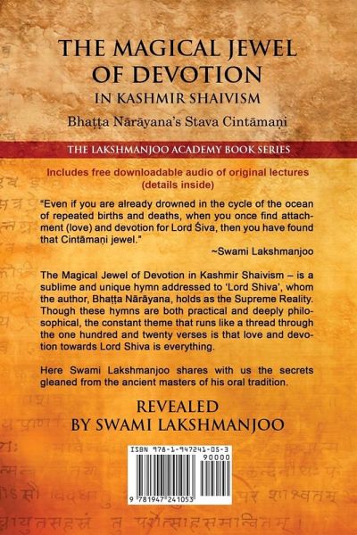 "Even if you are already drowned in the cycle of the ocean of repeated births and deaths, when you once find attachment (love) and devotion for Lord Shiva, then you have found that Cintamani jewel." ~Swami Lakshmanjoo "The Magical Jewel of Devotion in Kashmir Shaivism - Stava Cintamani" as revealed by Swami Lakshmanjoo, is a sublime and unique hymn addressed to ‘Lord Shiva’, whom the author, Bhatta Narayana, clearly holds as the Supreme Reality. Though these hymns are both practical and deeply philosophical, the constant theme that runs like a thread through the one hundred and twenty verses…mehr