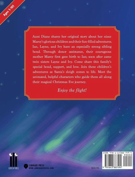 Aunt Diane shares her original story about her niece Marcy's glorious children and their fun-filled adventures. Ian, Layne, and Ivy have an especially strong sibling bond. Through donor assistance, their courageous mother Marcy first gave birth to Ian; soon after came twin sisters Layne and Ivy. Come share this family's special bond, support, and love. Join these children's adventures as Santa's sleigh comes to life. Meet the animated, helpful characters who guide them all along their magical Christmas Eve journey. Enjoy the flight!