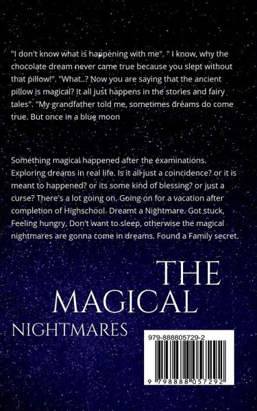 "I don't know what is happening with me". "I know, why the chocolate dream never came true because you slept without that pillow!". "What...? Now you are saying that the ancient pillow is magical? ". "It all just happens in the stories and fairy tales". "My grandfather told me, sometimes dreams do come true. But once in a blue moon". Something magical happened after the examinations. Exploring dreams in real life. Is it all just a coincidence? or it is meant to happened? or its some kind of blessing? or just a curse? There's a lot going on. Going on for a vacation after completion of Highschool. Dreamt a Nightmare. Got stuck, Feeling hungry, Don't want to sleep, otherwise the magical nightmares are gonna come in dreams. Found a Family secret.