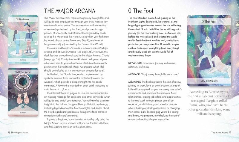 From images of symbolic animals (like wolves and bears), to depictions of the Northern Lights and Nordic Tree of Life, The Magical Nordic Tarot is filled with powerful imagery. There are references to the Nordic Gods and Goddesses, including Odin and Freya, and images of key Nordic symbols, such as the Nordic compass and Rune stones. References to some of the key characters in Nordic myths include a mischievous squirrel called Ratatoskr, who would run up and down the Tree of Life stirring up trouble between the eagle on top and the serpent at the bottom. The deck also includes a book giving detailed information about each card, along with key words, an inspirational message andinteresting Nordic legends.