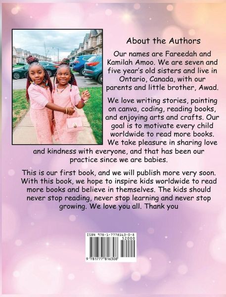 Our names are Fareedah and Kamilah Amoo. We are seven and five year's old sisters and live in Ontario, Canada, with our parents and little brother, Awad. We love writing stories, painting on canva, coding, reading books, and enjoying arts and crafts. Our goal is to motivate every child worldwide to read more books. We take pleasure in sharing love and kindness with everyone, and that has been our practice since we are babies. This is our first book, and we will publish more very soon. With this book, we hope to inspire kids worldwide to read more books and believe in themselves. The kids should never stop reading, never stop learning and never stop growing. We love you all. Thank you