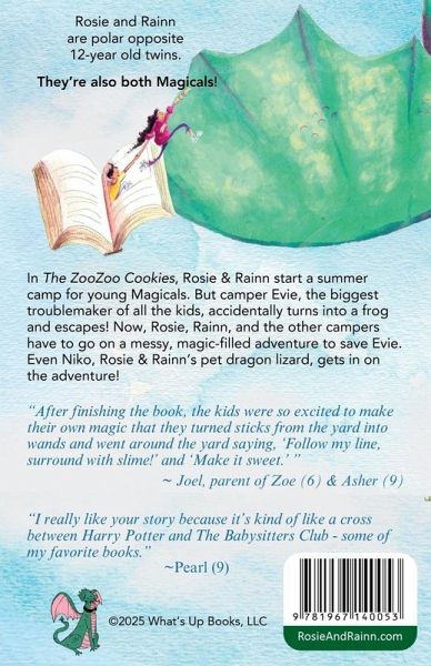 Rosie and Rainn are polar-opposite 12-year-old twins-who just happen to be Magicals! In The ZooZoo Cookies, the first book in the series, the twins start a summer camp for young Magicals. But when camper Evie-the biggest troublemaker of them all-accidentally turns herself into a frog and hops away, Rosie, Rainn, and the other campers embark on a messy, magic-filled adventure to bring her back. Even Niko, their mischievous pet dragon lizard, can't resist getting in on the action! Perfect for kids ages 7-10, The ZooZoo Cookies is a funny, fast-paced chapter book packed with playful magic, adventure, sibling antics, hand-drawn illustrations, and a flying dragon lizards. Designed for independent readers and reluctant readers alike, The ZooZoo Cookies has short, engaging chapters and laugh-out-loud moments, making it a great choice for classroom read-alouds, bedtime stories, or kids looking for their next favorite series. João Francisco's original, hand-drawn illustrations are detailed yet playful, helping immerse young readers in the story-especially kids who love books with dynamic, eye-catching artwork. BONUS MATERIALS 1st Edition Exclusive ~ enjoy a bonus Rosie & Rainn short story, The Magical Baker, along with engaging activities including designing your own Magic Moodband(TM) (What's a Magic Moodband(TM)?! Here's a hint: Rosie's Magic Moodband(TM) always knows how she's feeling and is the only headband that can hold back her crazy curls! Read the story to learn more.)