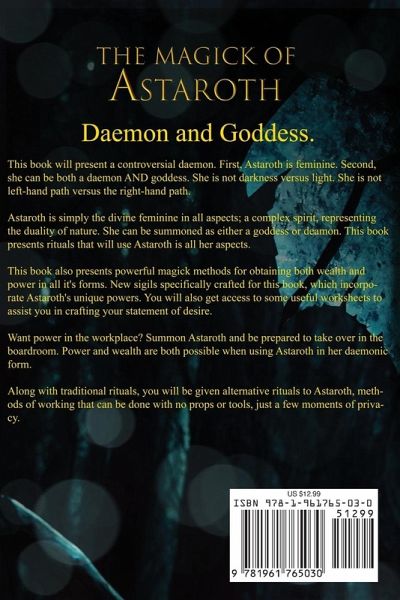The Magick of Astaroth: Rituals for Power and Wealth Daemon and Goddess. This book will present a controversial daemon. First, Astaroth is feminine. Second, she can be both a daemon AND goddess. She is not darkness versus light. She is not left-hand path versus the right-hand path. Astaroth is simply the divine feminine in all aspects; a complex spirit, representing the duality of nature. She can be summoned as either a goddess or deamon. This book presents rituals that will use Astaroth is all her aspects. This book also presents powerful magick methods for obtaining both wealth and power in all it's forms. New sigils specifically crafted for this book, which incorporate Astaroth's unique powers. You will also get access to some useful worksheets to assist you in crafting your statement of desire. Want power in the workplace? Summon Astaroth and be prepared to take over in the boardroom. Power and wealth are both possible when using Astaroth in her daemonic form. Power in the bedroom is assured when asking Astaroth in her goddess form for help. Along with traditional rituals, you will be given alternative rituals to Astaroth, methods of working that can be done with no props or tools, just a few moments of privacy.