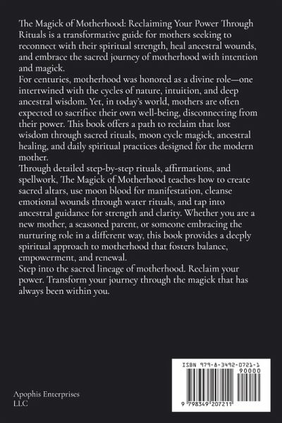 The Magick of Motherhood: Reclaiming Your Power Through Rituals is a transformative guide for mothers seeking to reconnect with their spiritual strength, heal ancestral wounds, and embrace the sacred journey of motherhood with intention and magick. For centuries, motherhood was honored as a divine role-one intertwined with the cycles of nature, intuition, and deep ancestral wisdom. Yet, in today's world, mothers are often expected to sacrifice their own well-being, disconnecting from their power. This book offers a path to reclaim that lost wisdom through sacred rituals, moon cycle magick, ancestral healing, and daily spiritual practices designed for the modern mother. Through detailed step-by-step rituals, affirmations, and spellwork, The Magick of Motherhood teaches how to create sacred altars, use moon blood for manifestation, cleanse emotional wounds through water rituals, and tap into ancestral guidance for strength and clarity. Whether you are a new mother, a seasoned parent, or someone embracing the nurturing role in a different way, this book provides a deeply spiritual approach to motherhood that fosters balance, empowerment, and renewal. Step into the sacred lineage of motherhood. Reclaim your power. Transform your journey through the magick that has always been within you.