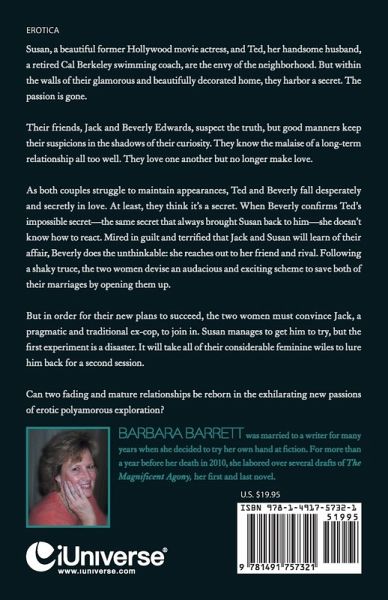 Susan, a beautiful former Hollywood movie actress, and Ted, her handsome husband, a retired Cal Berkeley swimming coach, are the envy of the neighborhood. But within the walls of their glamorous and beautifully decorated home, they harbor a secret. The passion is gone. Their friends, Jack and Beverly Edwards, suspect the truth, but good manners keep their suspicions in the shadows of their curiosity. They know the malaise of a long-term relationship all too well. They love one another but no longer make love. As both couples struggle to maintain appearances, Ted and Beverly fall desperately and secretly in love. At least, they think it's a secret. When Beverly confirms Ted's impossible secret-the same secret that always brought Susan back to him-she doesn't know how to react. Mired in guilt and terrified that Jack and Susan will learn of their affair, Beverly does the unthinkable: she reaches out to her friend and rival. Following a shaky truce, the two women devise an audacious and exciting scheme to save both of their marriages by opening them up. But in order for their new plans to succeed, the two women must convince Jack, a pragmatic and traditional ex-cop, to join in. Susan manages to get him to try, but the first experiment is a disaster. It will take all of their considerable feminine wiles to lure him back for a second session. Can two fading and mature relationships be reborn in the exhilarating new passions of erotic polyamorous exploration?