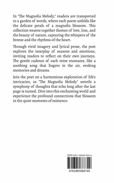 In "The Magnolia Melody," readers are transported to a garden of words, where each poem unfolds like the delicate petals of a magnolia blossom. This collection weaves together themes of love, loss, and the beauty of nature, capturing the whispers of the breeze and the rhythms of the heart. Through vivid imagery and lyrical prose, the poet explores the interplay of seasons and emotions, inviting readers to reflect on their own journeys. The gentle cadence of each verse resonates, like a soothing song that lingers in the air, evoking memories and dreams. Join the poet on a harmonious exploration of life's intricacies, as "The Magnolia Melody" unveils a symphony of thoughts that echo long after the last page is turned. Dive into this enchanting world and experience the profound connections that blossom in the quiet moments of existence.