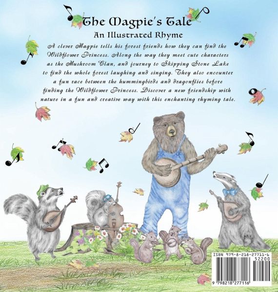 Walk along with new forest friends as they journey from the Wishing Well to the Bridge of Forget Me Nots, just past the Reeds of Make Believe Things. Then onto Skipping Stone Lake and laugh along with the friendly trees and animals of the forest as they sing and play musical instruments. Everyone is excited to watch the hummingbirds race the dragonflies while their friends cheer them to the finish line. You'll then find the flower nymphs and dandelion cubs surrounding the Wildflower Princess in the Meadow of Wishes and Dreams. The frogs and snails celebrate the rains under a colorful rainbow that shines bright and helps the little sprouts to grow. Discover a new friendship with nature with this enchanting rhyme, and take time to listen to The Magpie's Tale.