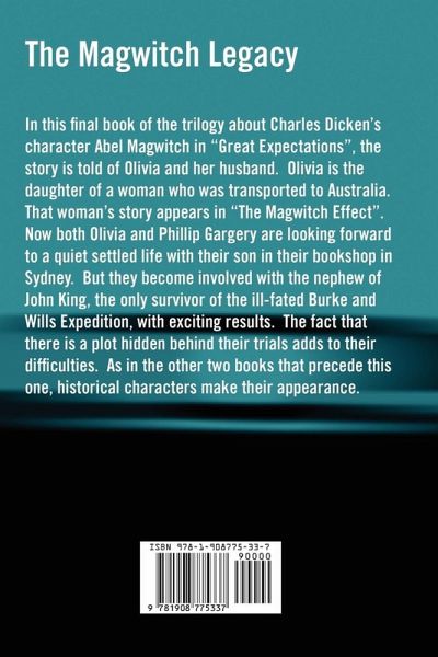 In this final book of the trilogy about Charles Dicken's character Abel Magwitch in "Great Expectations", the story is told of Olivia and her husband. Olivia is the daughter of a woman who was transported to Australia. That woman's story appears in "The Magwitch Effect". Now both Olivia and Phillip Gargery are looking forward to a quiet settled life with their son in their bookshop in Sydney. But they become involved with the nephew of John King, the only survivor of the ill-fated Burke and Wills Expedition, with exciting results. The fact that there is a plot hidden behind their trials adds to their difficulties. As in the other two books that precede this one, historical characters make their appearance.
