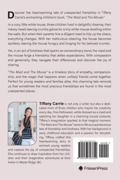Discover the heartwarming tale of unexpected friendship in Tiffany Carrie's enchanting children's book, "The Maid and The Mouse." In a cozy little white house, three children lived in delightful disarray, their messy meals leaving crumbs galore for a tiny white mouse dwelling within the walls. But when their parents hire a diligent maid to tidy up the chaos, everything changes. With her meticulous cleaning, the house becomes spotless, leaving the mouse hungry and longing for his beloved crumbs. Yet, in an act of kindness that sparks an extraordinary bond, the maid and the mouse forge a friendship that defies expectations. With compassion and generosity, they navigate their differences and discover the joy of sharing. "The Maid and The Mouse" is a timeless story of empathy, companionship, and the magic that happens when unlikely friends come together. Perfect for young readers and families alike, this charming tale reminds us that sometimes the most precious friendships are found in the most unexpected places.