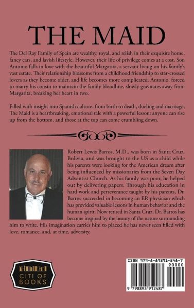 The Del Ray Family of Spain are wealthy, royal, and relish in their exquisite home, fancy cars, and lavish lifestyle. However, their life of privilege comes at a cost. Son Antonio falls in love with the beautiful Margarita, a servant living on his family's vast estate. Their relationship blossoms from a childhood friendship to star-crossed lovers as they become older, and life becomes more complicated. Antonio, forced to marry his cousin to maintain the family bloodline, slowly gravitates away from Margarita, breaking her heart in two. Filled with insight into Spanish culture, from birth to death, dueling and marriage, The Maid is a heartbreaking, emotional tale with a powerful lesson: anyone can rise up from the bottom, and those at the top can come crumbling down. About the Author Robert Lewis Barros, M.D., was born in Santa Cruz, Bolivia, and was brought to the US as a child while his parents were looking for the American dream after being influenced by missionaries from the Seven Day Adventist Church. As his family was poor, he helped out by delivering papers. Through his education in hard work and perseverance taught by his parents, Dr. Barros succeeded in becoming an ER physician which has provided valuable lessons in human behavior and the human spirit. Now retired in Santa Cruz, Dr. Barros has become inspired by the beauty of the nature surrounding him to write. His imagination carries him to placed he has never seen filled with love, romance, and, at time, adversity.