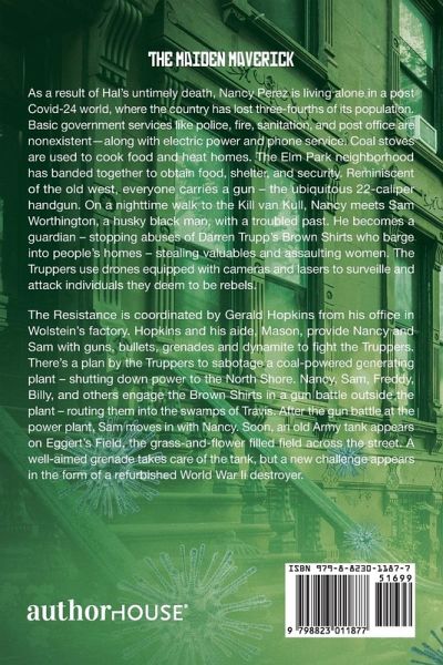 The Maiden Maverick As a result of Hal's untimely death, Nancy Perez is living alone in a post Covid-24 world, where the country has lost three-fourths of its population. Basic government services like police, fire, sanitation, and post office are nonexistent-along with electric power and phone service. Coal stoves are used to cook food and heat homes. The Elm Park neighborhood has banded together to obtain food, shelter, and security. Reminiscent of the old west, everyone carries a gun - the ubiquitous 22-caliper handgun. On a nighttime walk to the Kill van Kull, Nancy meets Sam Worthington, a husky black man, with a troubled past. He becomes a guardian - stopping abuses of Darren Trupp's Brown Shirts who barge into people's homes - stealing valuables and assaulting women. The Truppers use drones equipped with cameras and lasers to surveille and attack individuals they deem to be rebels. The Resistance is coordinated by Gerald Hopkins from his office in Wolstein's factory. Hopkins and his aide, Mason, provide Nancy and Sam with guns, bullets, grenades and dynamite to fight the Truppers. There's a plan by the Truppers to sabotage a coal-powered generating plant - shutting down power to the North Shore. Nancy, Sam, Freddy, Billy, and others engage the Brown Shirts in a gun battle outside the plant - routing them into the swamps of Travis. After the gun battle at the power plant, Sam moves in with Nancy. Soon, an old Army tank appears on Eggert's Field, the grass-and-flower filled field across the street. A well-aimed grenade takes care of the tank, but a new challenge appears in the form of a refurbished World War Ii destroyer.