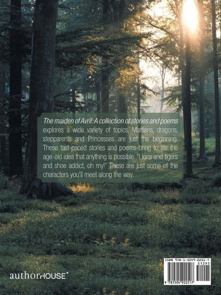 The maiden of Avril: A collection of stories and poems explores a wide variety of topics. Martians, dragons, stepparents and Princesses are just the beginning. These fast-paced stories and poems bring to life the age-old idea that anything is possible. "Lions and tigers and shoe addict, oh my!" These are just some of the characters you'll meet along the way.
