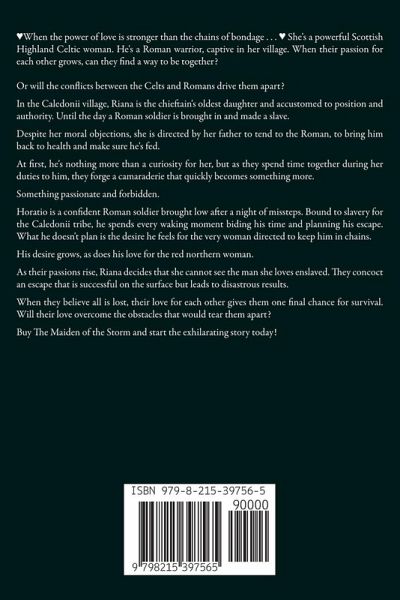 She's a powerful Scottish Highland Celtic woman. He's a Roman warrior, captive in her village. Can the power of their love break the the chains of bondage? Or will the conflicts between the Celts and Romans drive them apart? In their Caledonii village, Riana is the chieftain's oldest daughter and accustomed to position and authority. Until the day a Roman soldier is brought in and enslaved. Despite her moral objections, she is directed by her father to tend to the Roman, to bring him back to health and make sure he's fed. At first, he's nothing more than a curiosity for her, but as they spend time together during her duties to him, they forge a camaraderie that quickly becomes something more. Something passionate and forbidden. Horatio is a confident Roman soldier brought low after a night of missteps. Bound to slavery for the Caledonii tribe, he spends every waking moment biding his time and planning his escape. What he doesn't plan is the desire he feels for the very woman directed to keep him in chains. His desire grows, as does his love for the red northern woman. As their passions rise, Riana decides that she cannot see the man she loves enslaved. They concoct an escape that is successful on the surface but leads to disastrous results. When they believe all is lost, their love for each other gives them one final chance for survival. Will their love overcome the obstacles that would tear them apart? Read The Maiden of the Storm and start the exhilarating story today! The novels in this series are each stand-alone and can be read individually in any order, if desired. These historical romances are set in ancient Scottish Highlands and do not shy away from steamy scenes, occasional archaic curses, and accurate scenes of ancient life!