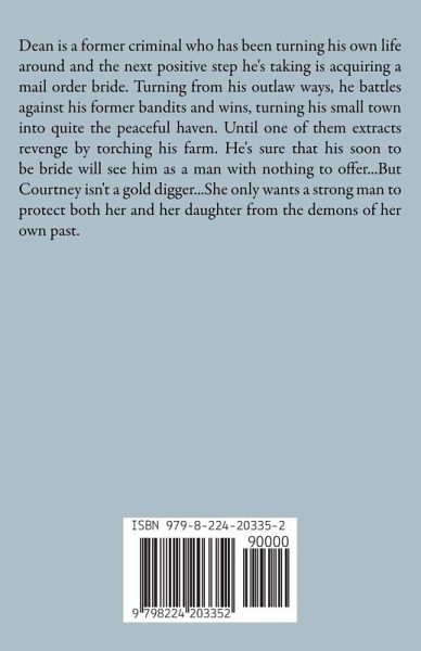 Dean is a former criminal who has been turning his own life around and the next positive step he's taking is acquiring a mail order bride. Turning from his outlaw ways, he battles against his former bandits and wins, turning his small town into quite the peaceful haven. Until one of them extracts revenge by torching his farm. He's sure that his soon to be bride will see him as a man with nothing to offer...But Courtney isn't a gold digger...She only wants a strong man to protect both her and her daughter from the demons of her own past.