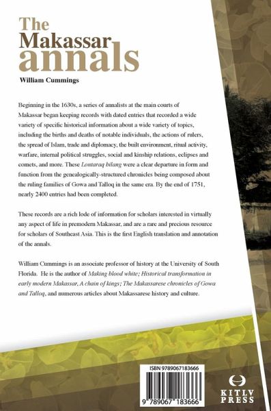 Beginning in the 1630s, a series of annalists at the main courts of Makassar began keeping records with dated entries that recorded a wide variety of specific historical information about a wide variety of topics, including the births and deaths of notable individuals, the actions of rulers, the spread of Islam, trade and diplomacy, the built environment, ritual activity, warfare, internal political struggles, social and kinship relations, eclipses and comets, and more. These Lontaraq bilang were a clear departure in form and function from the genealogically-structured chronicles being composed about the ruling families of Gowa and Talloq in the same era.