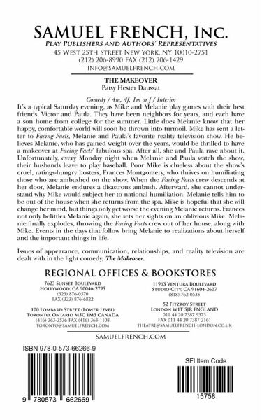 Comedy / 4m, 4f, 1m or f / Interior Set It's a typical Saturday evening, as Mike and Melanie play games with their best friends, Victor and Paula. They have been neighbors for years, and each have a son home from college for the summer. Little does Melanie know that her happy, comfortable world will soon be thrown into turmoil. Mike has sent a letter to Facing Facts, Melanie and Paula's favorite reality television show. He believes Melanie, who has gained weight over the years, would be thrilled to have a makeover at Facing Facts' fabulous spa. After all, she and Paula rave about it. Unfortunately, every Monday night when Melanie and Paula watch the show, their husbands leave to play baseball. Poor Mike is clueless about the show's cruel, ratings-hungry hostess, Frances Montgomery, who thrives on humiliating those who are ambushed on the show. When the Facing Facts crew descends at her door, Melanie endures a disastrous ambush. Afterward, she cannot understand why Mike would subject her to national humiliation. Melanie tells him to be out of the house when she returns from the spa. Mike is hopeful that she will change her mind, but things only get worse the evening Melanie returns. Frances not only belittles Melanie again, she sets her sights on an oblivious Mike. Melanie finally explodes, throwing the Facing Facts crew out of her house, along with Mike. Events in the days that follow bring Melanie to realizations about herself and the important things in life. Issues of appearance, communication, relationships, and reality television are dealt with in the light comedy, The Makeover.