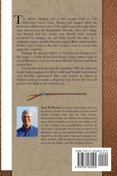 The Maker's Medicine Girl is the second book in THE FLINTLOCK SAGAS series. Terrors and dangers filled the Kentucky wilderness in the 1770's, and no one knew this better than sixteen-year-old Remember Warren. After her village was burned and her family and friends were violently murdered by savages, the girl finds herself the slave of a renegade trapper and his Shawnee squaw. Bitter and resentful, Ember rejects God as she tries to find a way to survive the oppressive captivity. Though she doesn't believe it, God has not forsaken her. He begins to work on her hard heart, using creative ways to reveal Himself to her and to show His love to her and to those around her. Can Ember look beyond the hardship? Will she listen for God's higher purpose for all her suffering? Could God redeem such horrible experiences? The story reaches its climax as Ember is forced to make a desperate run for her life that will put her new faith to the extreme test.