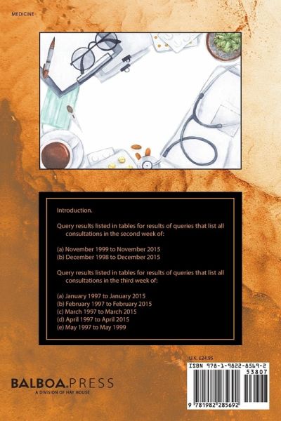 Introduction. Query results listed in tables for results of queries that list all consultations in the second week of: (a) November 1999 to November 2015 (b) December 1998 to December 2015 Query results listed in tables for results of queries that list all consultations in the third week of: (a) January 1997 to January 2015 (b) February 1997 to February 2015 (c) March 1997 to March 2015 (d) April 1997 to April 2015 (e) May 1997 to May 1999