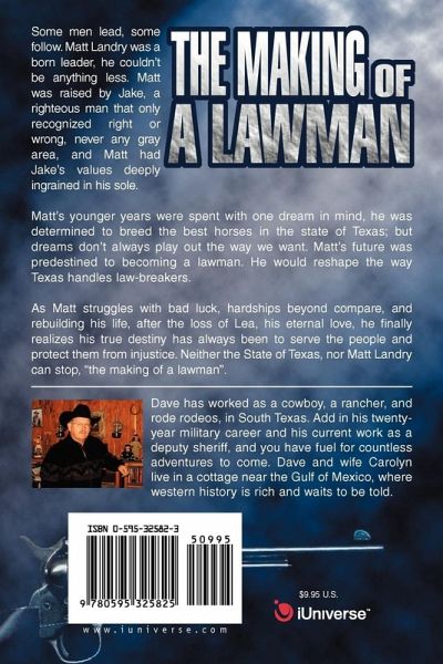 Some men lead, some follow. Matt Landry was a born leader, he couldn't be anything less. Matt was raised by Jake, a righteous man that only recognized right or wrong, never any gray area, and Matt had Jake's values deeply ingrained in his sole. Matt's younger years were spent with one dream in mind, he was determined to breed the best horses in the state of Texas; but dreams don't always play out the way we want. Matt's future was predestined to becoming a lawman. He would reshape the way Texas handles law-breakers. As Matt struggles with bad luck, hardships beyond compare, and rebuilding his life, after the loss of Lea, his eternal love, he finally realizes his true destiny has always been to serve the people and protect them from injustice. Neither the State of Texas, nor Matt Landry can stop, "the making of a lawman".