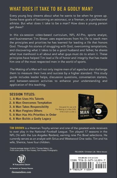 What Does It Take to Be a Godly Man? Every young boy dreams about what he wants to be when he grows up. Some have goals of becoming an astronaut, or a fireman, or a professional athlete. But what does it take to be a man? How does a young person get there? In this six-session video-based curriculum (DVD/digital video sold separately), NFL All-Pro, sports analyst, and businessman Tim Brown uses experiences from his life to teach men the principles and priorities he has learned for leading a life that honors God. Through his stories of struggling with God, overcoming temptations, and discovering what it takes to be a good husband and father, he shares what true manhood is all about and what guys must do to attain it. These principles have helped Tim lead a life of honor and integrity that has made him one of the most respected men in the world of sports. The Making of a Man will not only inspire men of all ages but also challenge them to measure their lives and success by a higher standard. Designed for use with The Making of a Man Video Study (sold separately).