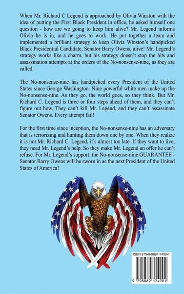 When Mr. Richard C Legend is approached by Olivia Winston with the idea of putting the First Black President in office, he asked himself one question - how are we going to keep him alive? Mr. Legend informs Olivia he is in, and he goes to work. He put together a team and implemented a brilliant strategy to keep Olivia Winston's handpicked Black Presidential Candidate, Senator Barry Owens, alive! Mr. Legend's strategy works like a charm, but his strategy doesn't stop the hits and assassination attempts at the orders of the No-nonsense-nine, as they are called. The No-nonsense-nine has handpicked every President of the United States since George Washington. Nine powerful white men make up the No-nonsense-nine. As they go, the world goes, so they think. But Mr. Richard C. Legend is three or four steps ahead of them, and they can't figure out how. They can't kill Mr. Legend, and they can't assassinate Senator Owens. Every attempt fail! For the first time since inception, the No-nonsense-nine has an adversary that is terrorizing and hunting them down one by one. When they realize it is not Mr. Richard C. Legend, it's almost too late. If they want to live, they need Mr. Legend's help. So they make Mr. Legend an offer he can't refuse. For Mr. Legend's support, the No-nonsense-nine GUARANTEE - Senator Barry Owens will be sworn in as the next President of the United States of America!