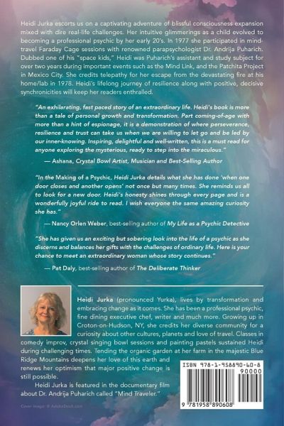 Heidi A. Jurka escorts us on a captivating adventure of blissful consciousness expansion mixed with dire real-life challenges. Her intuitive glimmerings as a child living in the Hudson Valley in New York evolved to her becoming a professional psychic by her early 20's living in California. Heidi awakened bolt upright one morning to an absolute certainty that she must return to NY. She arrived just in time to attend unprecedented classes offered by Dr. Andrija Puharich, renowned parapsychologist, physicist, author and inventor in Ossining, NY. Puharich was most well known for bringing intuitive/telekinesis expert Uri Geller to the USA, whose skilled were studied, tested and ultimately validated at Stanford Research Institute by the CIA in 1973. As the classes continued Puharich interviewed Heidi about her own extensive psychic experiences. In 1977 she was invited to participate in mind-travel Faraday Cage sessions facilitated by Puharich. Dubbed one of his "space kids," she was his assistant and study subject for over two years during important events including the Mind Link and the Pachita Project in Mexico City. She credits telepathy for her escape from the devastating fire at his home/lab in 1978. Heidi's lifelong journey of resiliency before and after these events along with amazingly positive and decisive synchronicities will keep her readers enthralled.