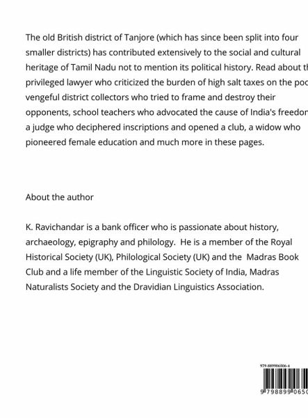 The old British district of Tanjore (which has since been split into 4 smaller districts) has contributed extensively to the social, cultural and political heritage of Tamil Nadu. Read about the privileged lawyer who criticized the burden of high salt tax on the poor, vengeful collectors who tried to frame and destroy their opponents, school teachers who advocated the cause of India's freedom, a judge who deciphered inscriptions and opened a club, a widow who pioneered female education and much more