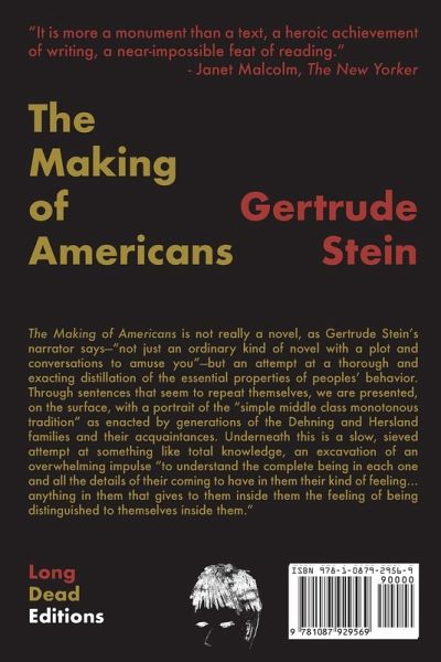 The Making of Americans is not really a novel, as Gertrude Stein's narrator says-"not just an ordinary kind of novel with a plot and conversations to amuse you"-but an attempt at a thorough and exacting distillation of the essential properties of peoples' behavior. Through sentences that seem to repeat themselves, we are presented, on the surface, with a portrait of the "simple middle class monotonous tradition" as enacted by generations of the Dehning and Hersland families and their acquaintances. Underneath this is a slow, sieved attempt at something like total knowledge, an excavation of an overwhelming impulse "to understand the complete being in each one and all the details of their coming to have in them their kind of feeling...anything in them that gives to them inside them the feeling of being distinguished to themselves inside them."