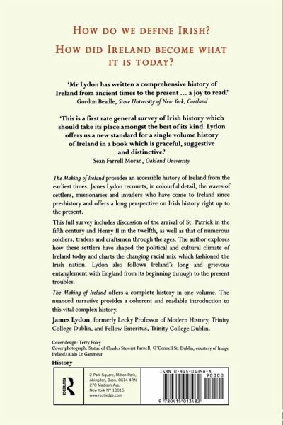 "The Making of Ireland" recounts, in colorful detail, the waves of settlers, missionaries and invaders who have come to Ireland since the pre-history age. This lively and long-viewed narrative includes discussion of the arrival of St. Patrick in the fifth century and Henry II in the twelfth, as well as the stories of numerous soldiers, traders and craftsmen through the ages. James Lydon explores how these settlers have shaped the political and cultural climate and charts the changing racial mix which makes up the Ireland of today.