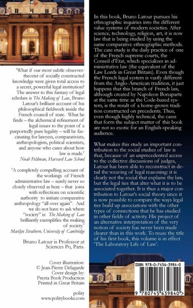 In this book, Bruno Latour pursues his ethnographic inquiries into the different value systems of modern societies. After science, technology, religion, art, it is now law that is being studied by using the same comparative ethnographic methods. The case study is the daily practice of one of the French supreme court, the Conseil d'Etat, specialized in administrative law (the equivalent of the Law Lords in Great Britain). Even though the French legal system is vastly different from the Anglo-American tradition, it just happens that this branch of French law, although created by Napoleon Bonaparte at the same time as the Code-based system, is the result of a home grown tradition constructed on precedents. Thus, even though highly technical, the cases that forms the matter of this book, are not so exotic for an English speaking audience. What makes this study an important contribution to the social studies of law is that, because of an unprecedented access to the collective discussions of judges, Latour has been able to reconstruct in details the weaving of legal reasoning: it is clearly not the social that explains the law, but the legal ties that alter what it is to be associated together. It is thus a major contribution to Latour's social theory since it is now possible to compare the ways legal ties build up associations with the other types of connections that he has studied in other fields of acticity. His project of an alternative interpretation of the very notion of society has never been made clearer than in this work. To reuse the title of his first book, this book is in effect the Laboratory Life of Law.