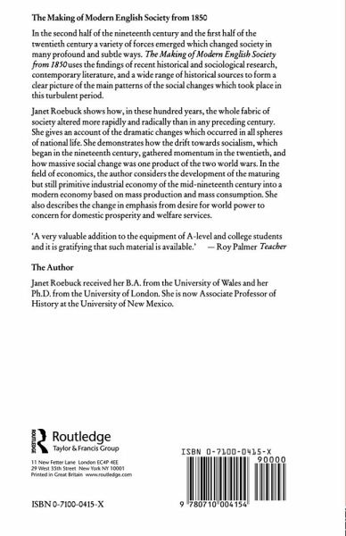 In the second half of the nineteenth century and the first half of the twentieth century a variety of forces emerged which changed society in many profound and subtle ways. The Making of Modern English Society from 1850 uses the findings of recent historical and sociological research contemporary literature, and a wide range of historical sources to form a clear picture of the main patterns of the social changes which took place in this turbulent period. Jane Roebuck shows how in these hundred years the whole fabric of society altered more rapidly and radically than in ant preceding century. She gives and account of the dramatic change which occurred in all spheres of national liked. She demonstrates how the drift towards socialism, which began in the nineteenth century, gathered momentum in the twentieth and how massive social chance was on produce of the two world wars. In the field of economics, the author considers the development of the maturing but still primitive industrial economy of the mid-nineteenth century into a modern economy based on mass production and mass consumption. She also describes the change in emphasis from desire for world power to concern for domestic prosperity and welfare services.