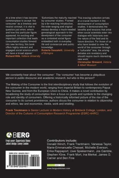 We constantly hear about 'the consumer'. The 'consumer' has become a ubiquitous person in public discourse and academic research, but who is this person? The Making of the Consumer is the first interdisciplinary study that follows the evolution of the consumer in the modern world, ranging from imperial Britain to contemporary Papua New Guinea, and from the European Union to China. It makes a novel contribution by broadening the study of consumption from a focus on goods and symbols to the changing role and identity of consumers. Offering a historically informed picture of the rise of the consumer to its current prominence, authors discuss the consumer in relation to citizenship and ethics, law and economics, media, work and retailing.Contributors include:Donald Winch (University of Sussex)Frank Trentmann (Birkbeck College, University of London)Vanessa Taylor (Birkbeck College, University of London)Marie-Emmanuelle Chessel (CNRS: Centre de Recherches Historiques, cole des Hautes tudes en Sciences Sociales, Paris)Michelle Everson (Birkbeck College, University of London)Erika Rappaport (University of California, Santa Barbara)Uwe Spiekermann (Georg-August University, Gttingen)Jos Gamble (Royal Holloway University)Stephen Kline (Simon Fraser University, Vancouver, Canada)Frank Mort (University of Manchester)Ina Merkel (Philipps-Universitt, Marburg, Germany)James G. Carrier (Indiana University and Oxford Brookes University)Ben Fine (SOAS: School of Oriental and African Studies, University of London)