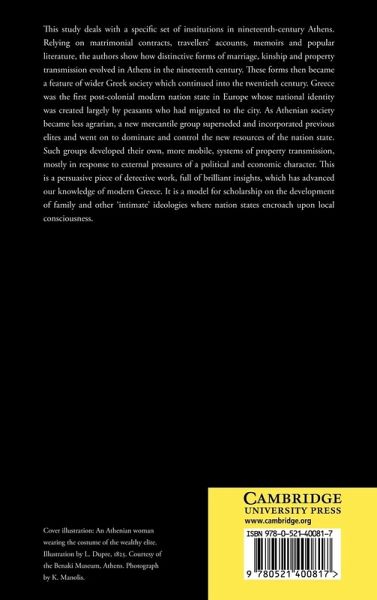This 1991 study deals with a specific set of institutions in nineteenth-century Athens. Relying on matrimonial contracts, travellers' accounts, memoirs and popular literature, the authors show how distinctive forms of marriage, kinship and property transmission evolved in Athens in the nineteenth century. These forms then became a feature of wider Greek society which continued into the twentieth century. Greece was the first post-colonial modern nation state in Europe whose national identity was created largely by peasants who had migrated to the city. As Athenian society became less agrarian, a new mercantile group superseded and incorporated previous elites and went on to dominate and control the new resources of the nation state. Such groups developed their own, more mobile, systems of property transmission, mostly in response to external pressures of a political and economic character. This is a persuasive piece of detective work which has advanced our knowledge of modern Greece. It is a model for scholarship on the development of family and other 'intimate' ideologies where nation states encroach upon local consciousness.