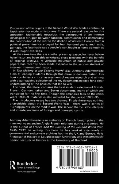 First published in 1979. In this text the Adamthwaite aims at leading students through the maze of documentation surrounding the Second World War. His book combines a critical assessment of recent research and writing with a painstaking selection of the key documents needed for a clear understanding of the policies that led to war. It contains the first student selection of British, French, German, Italian and Soviet documents, many of which are translated for the first time. Though emphasis falls on the years 1935-9, material is also included for the period 1929-35.