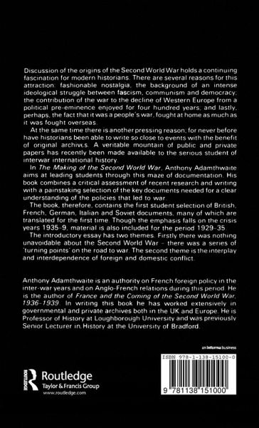First published in 1979. In this text the Adamthwaite aims at leading students through the maze of documentation surrounding the Second World War. His book combines a critical assessment of recent research and writing with a painstaking selection of the key documents needed for a clear understanding of the policies that led to war. It contains the first student selection of British, French, German, Italian and Soviet documents, many of which are translated for the first time. Though emphasis falls on the years 1935-9, material is also included for the period 1929-35.