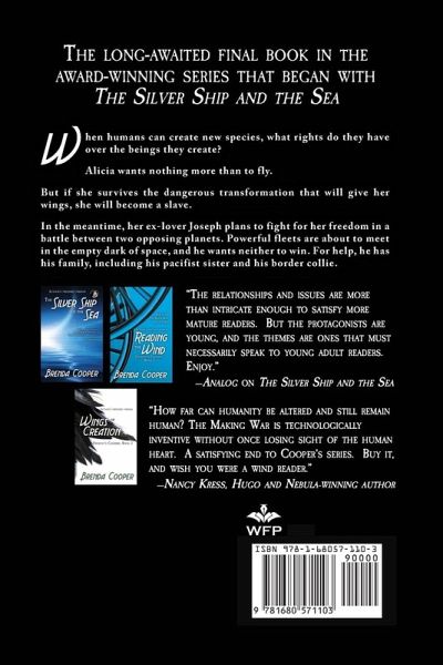 When humans can create new species, what rights do they have over the beings they create? The Making War is the long-awaited final book in the award-winning series that began with The Silver Ship and the Sea. Six genetically engineered children fought to survive in a small town where everyone hated what they were, on a difficult planet full of out-sized predators with long teeth and sharp claws. Because they were stronger than the colonists, they found a way to live, and eventually a way to leave. Alicia wants nothing more than to fly. But if she survives the dangerous transformation that will give her wings, she will become a slave. In the meantime, her ex-lover Joseph plans to fight for her freedom in a battle between two opposing planets. Powerful fleets are about to meet in the empty dark of space, and he wants neither to win. For help, he has his family, including his pacifist sister and his border collie.